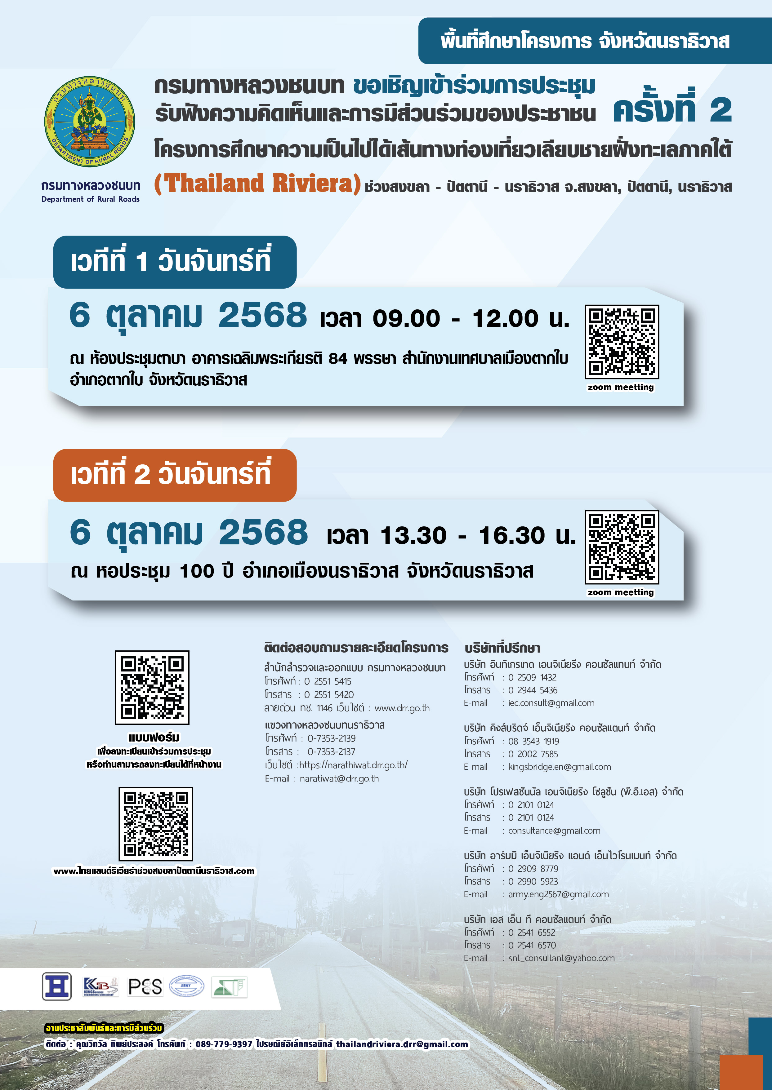 สำนักสำรวจและออกแบบ กรมทางหลวงชนบท อยู่ระหว่างดำเนินงานศึกษาโครงการศึกษาความเป็นไปได้เส้นทางท่องเที่ยวเลียบชายฝั่งทะเลภาคใต้ (Thailand Riviera) ช่วงสงขลา - ปัตตานี - นราธิวาส จังหวัดสงขลา, ปัตตานี, นราธิวาส เพื่อให้ทุกภาคส่วนที่เกี่ยวข้อง ได้รับทราบถึงข้อมูลเกี่ยวกับการดำเนินงานและเกิดความเข้าใจที่ถูกต้องเกี่ยวกับโครงการ รวมทั้งเกิดการบูรณาการทางความคิดกับทุกภาคส่วน ได้กำหนดให้มีการประชุมรับฟ